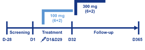 本研究入组的16例患者均完成第0周和第4周的共2次给药(SHR-1139 100mg组和SHR-1139 300mg组各6例、安慰剂组4例),各组的人口学和基线特征基本均衡,基线时银屑病面积与严重程度指数(PASI)评分分别为31.4、32.1、36.7,体表受累面积(BSA)分别为48.0%、52.3%、55.8%,静态医师全面评估(sPGA)>3分的患者比例分别为83.3%、66.7%、100%。