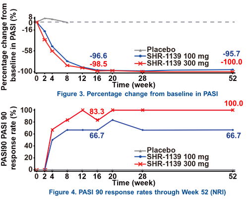 第16周时,SHR-1139各治疗组的临床有效率高于安慰剂组。第16周时,SHR-1139 300mg组和SHR-1139 100mg组的PASI 90应答率分别为83.3%和66.7%,PASI相对于基线的变化百分比分别为-98.5%和-96.6%。且临床应答持续至第52周。第52周时,两组的PASI 90应答率分别为100%和66.7%,PASI相对于基线的变化百分比分别为-100.0%和-95.7%。
